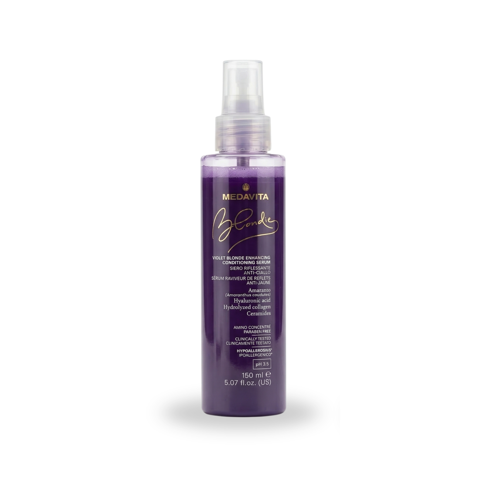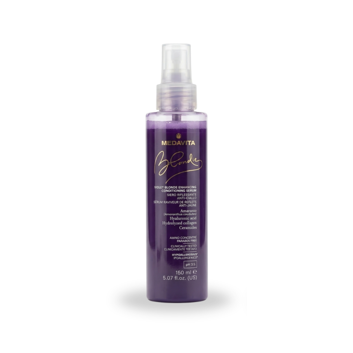 Blond impecabil, fără reflexii nedorite. Medavita Violet Blonde Conditioning Serum este un balsam spray inovator care neutralizează instantaneu tonurile galbene. Cu un pH de 3,5 și o formulă bogată în Colagen și Acid Hialuronic, acest ser tonifică reflexele reci, oferind în același timp volum, hidratare și o catifelare cosmetică de excepție, fără a necesita clătire.