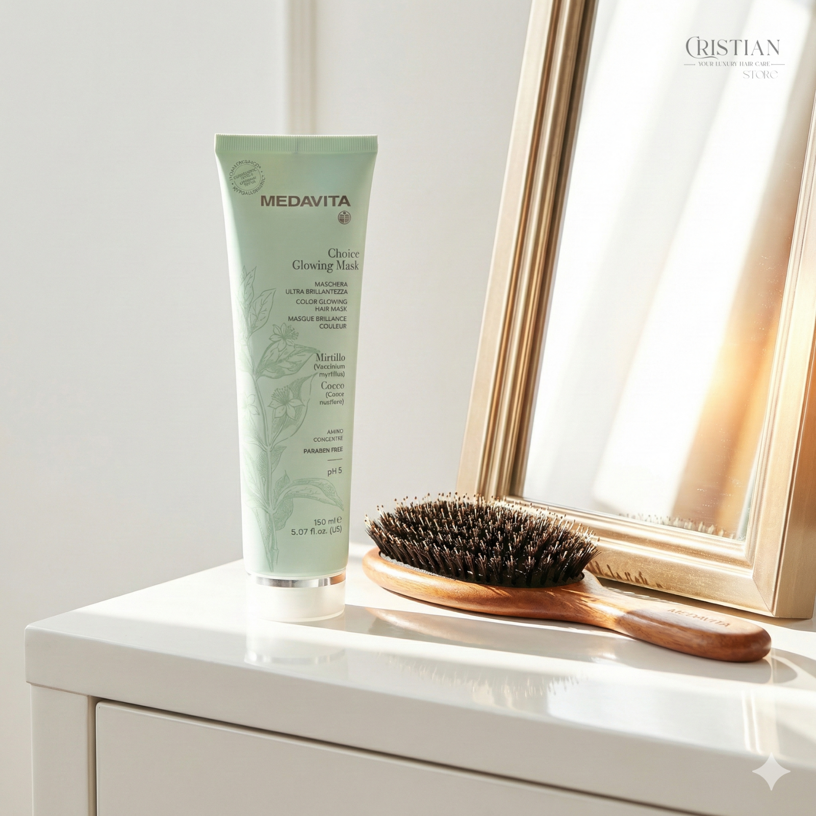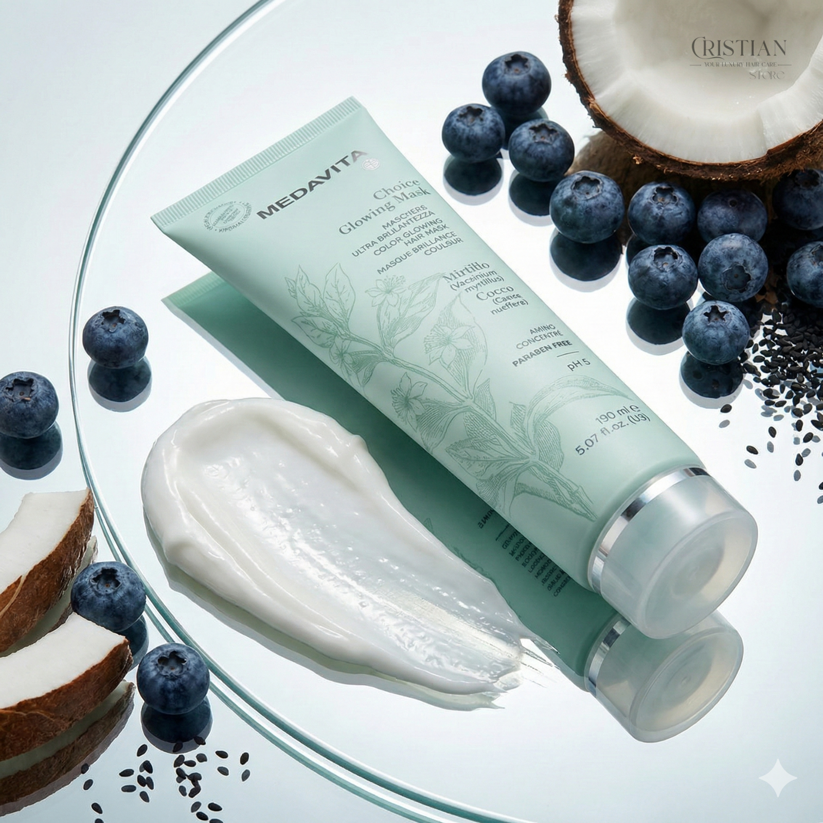 Un "Top Coat" de lux pentru părul tău. Medavita Choice Glowing Hair Mask este o îngrijire intensivă, hipoalergenică, care amplifică vibrația culorii și oferă o strălucire cristalină, hrănind fibra cu antioxidanți din Afine și Ulei de Cocos.