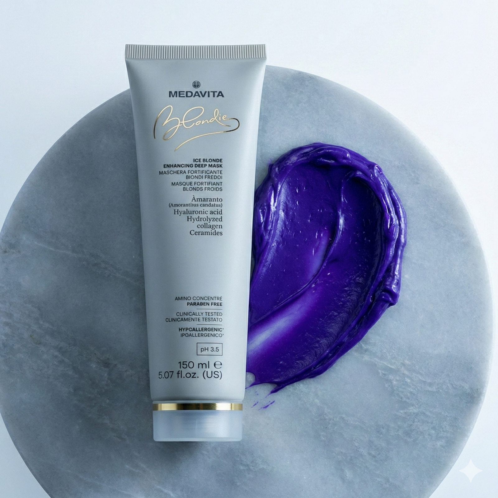 Neutralizează galbenul, păstrează hidratarea. Medavita Ice Blonde este o mască corectoare profesională pentru blondul rece. Formula sa combină pigmenți violeți intenși cu Acid Hialuronic și Colagen pentru a elimina reflexiile calde nedorite, reparând în același timp structura părului decolorat.