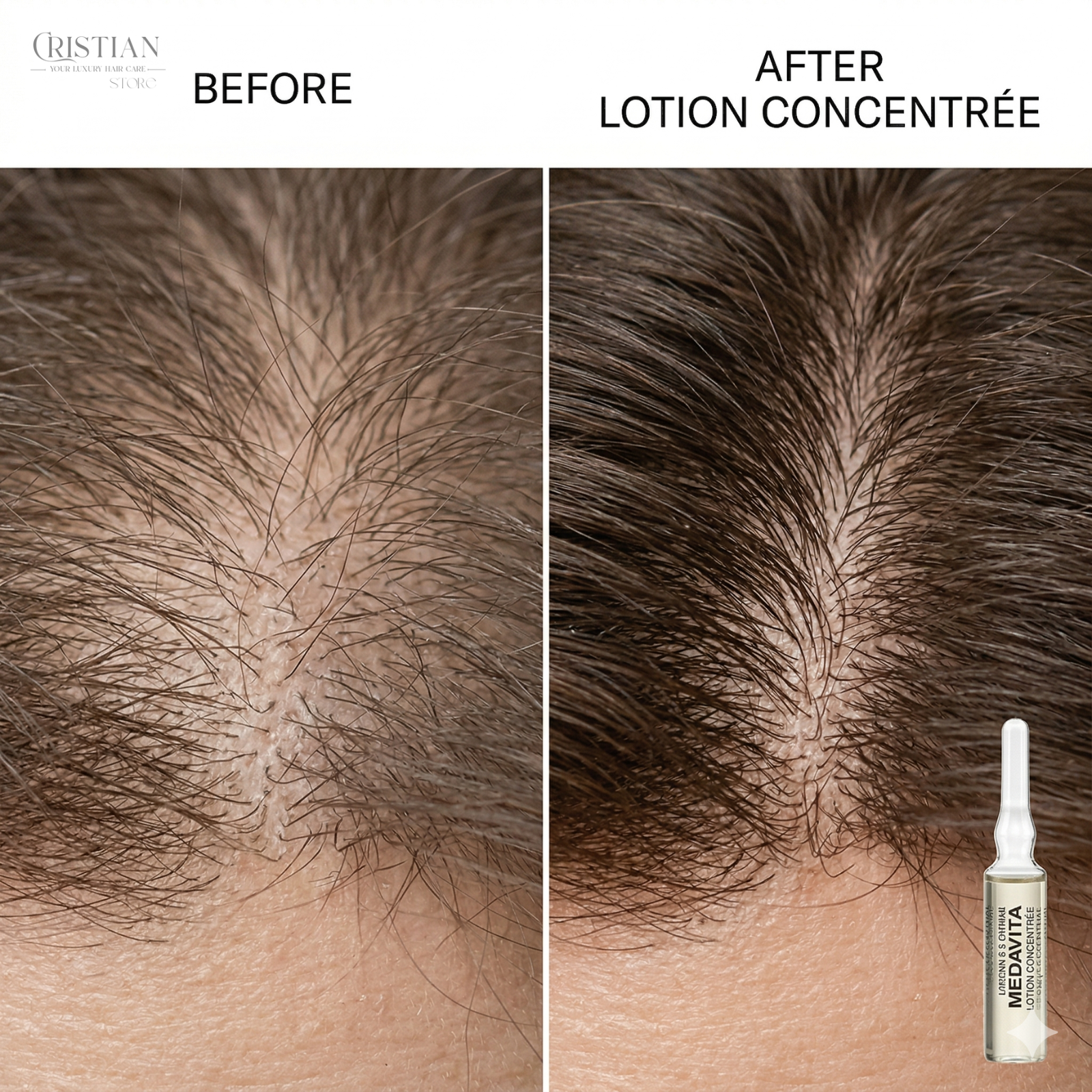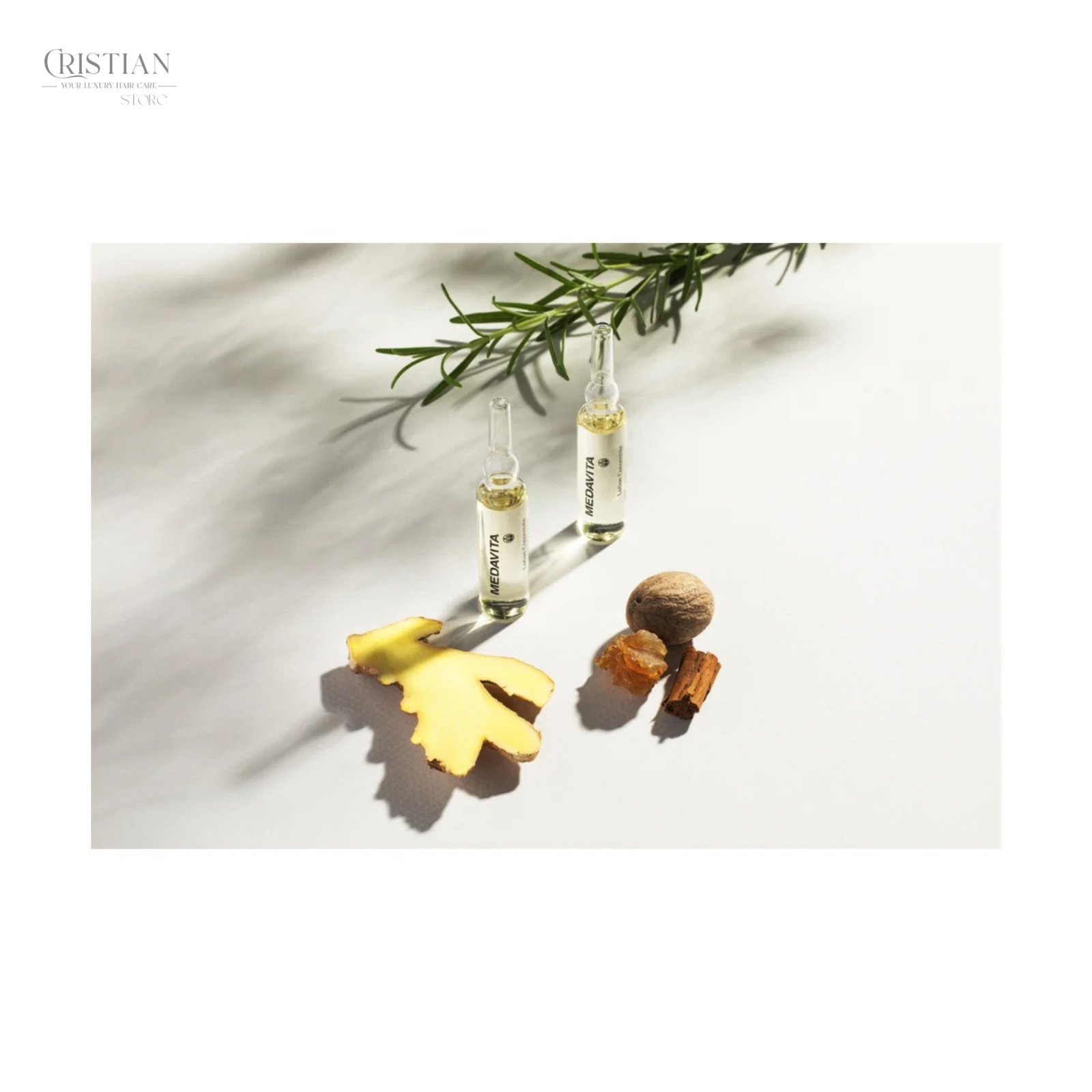 Energia pură a plantelor pentru o rădăcină de neclintit. Medavita Lotion Concentrée este o formulă intensivă adjuvantă sub formă de fiole, creată pentru a preveni căderea părului și a stimula regenerarea. Bazată pe un complex exclusiv de plante vasoactive (Arnica, Ghimbir, Rozmarin), această soluție leave-in cu pH 3.5 activează microcirculația, oxigenează scalpul și întărește sistemul de ancorare al firului de păr în folicul, prelungind vizibil ciclul de viață al podoabei capilare.