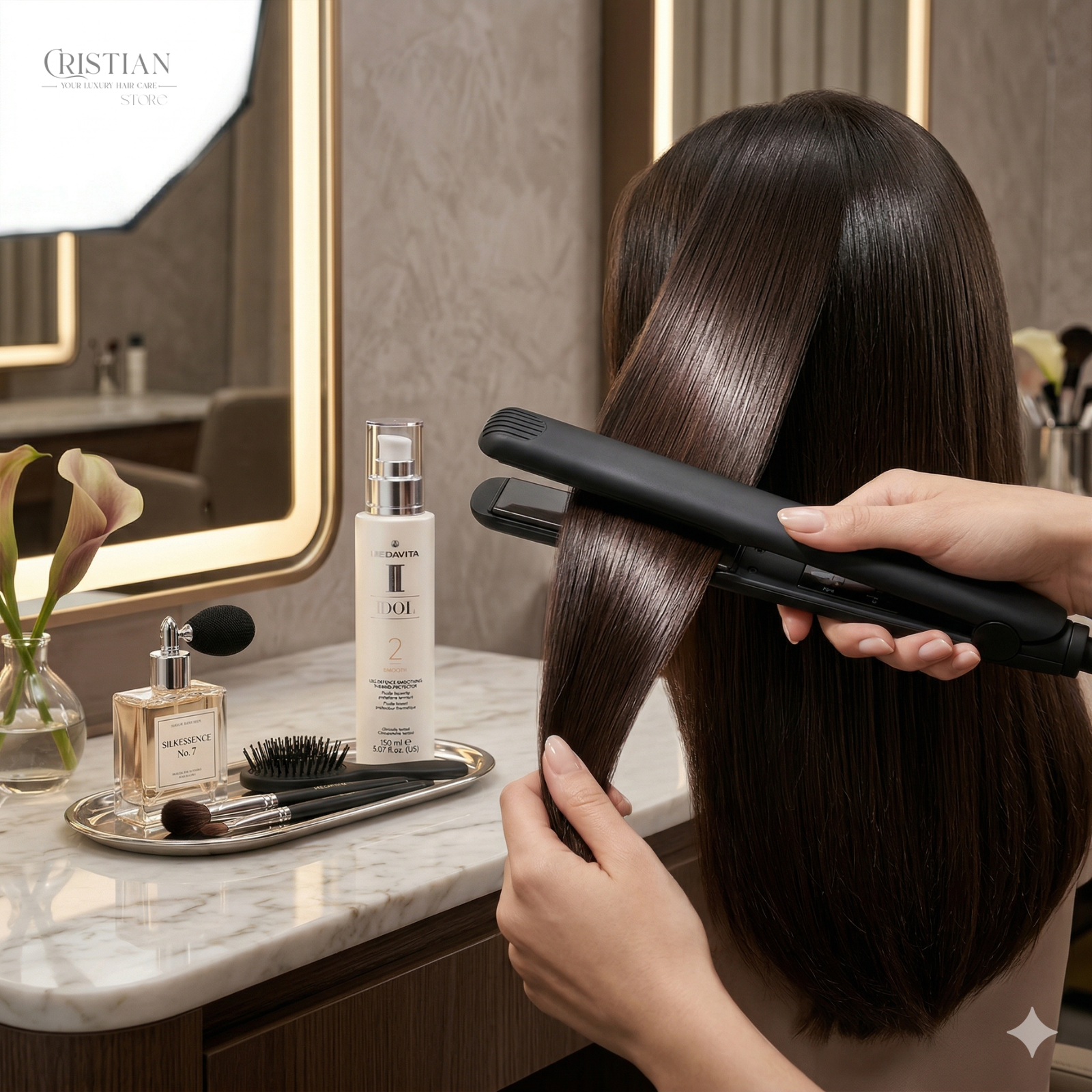 4. 🔥 Sfat de la salon: Dacă ai vârfurile foarte uscate, poți aplica o cantitate minusculă și pe părul uscat, chiar înainte de ultima trecere cu placa, pentru un sigiliu suplimentar de strălucire.