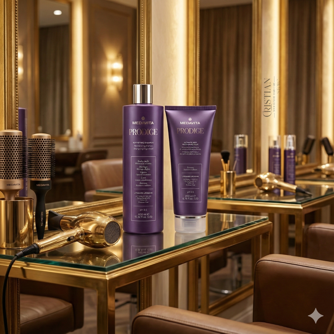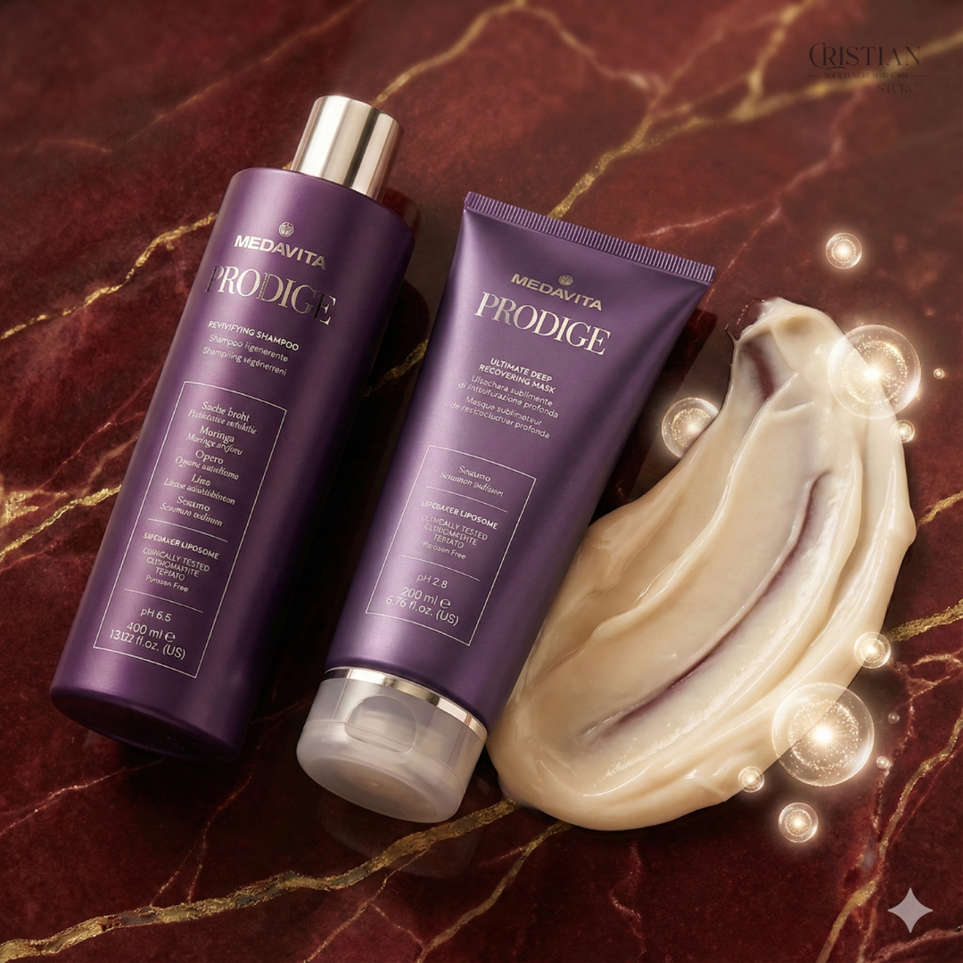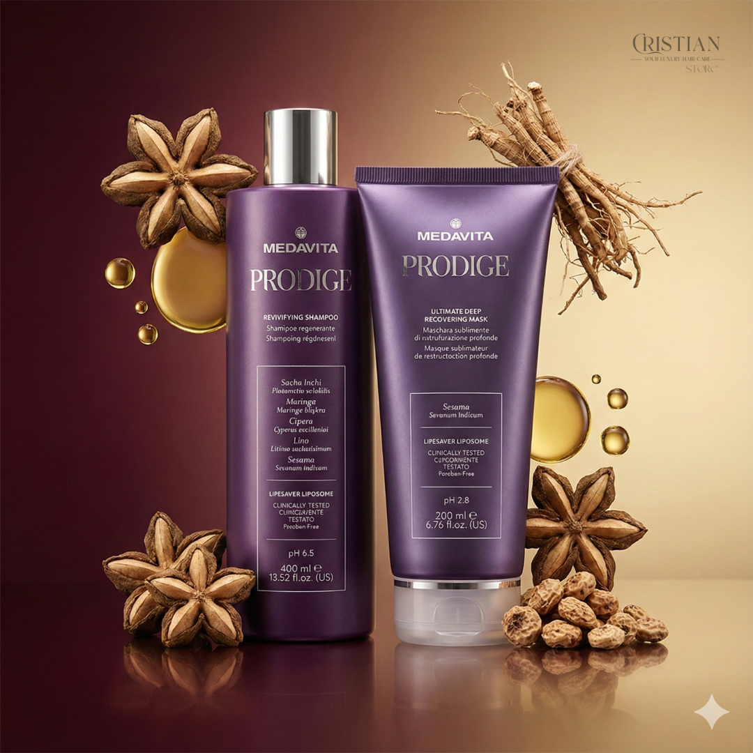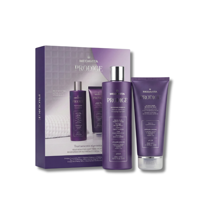 O "mașină a timpului" pentru părul degradat. Duo-ul Medavita Prodige (Șampon 400ml + Mască 200ml) este un sistem de regenerare instantă care acționează selectiv asupra zonelor distruse, folosind Lipozomi și uleiuri rare pentru a reface complet structura capilară.