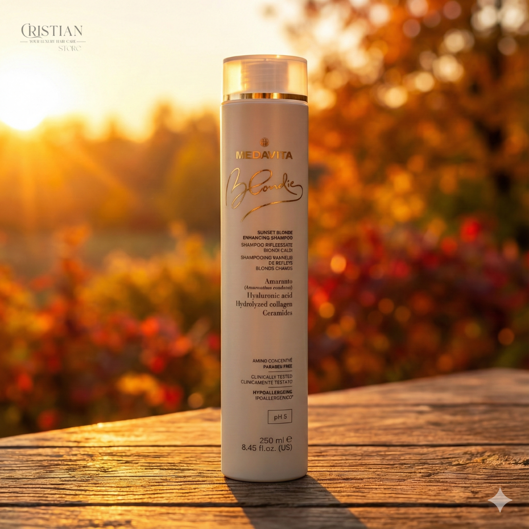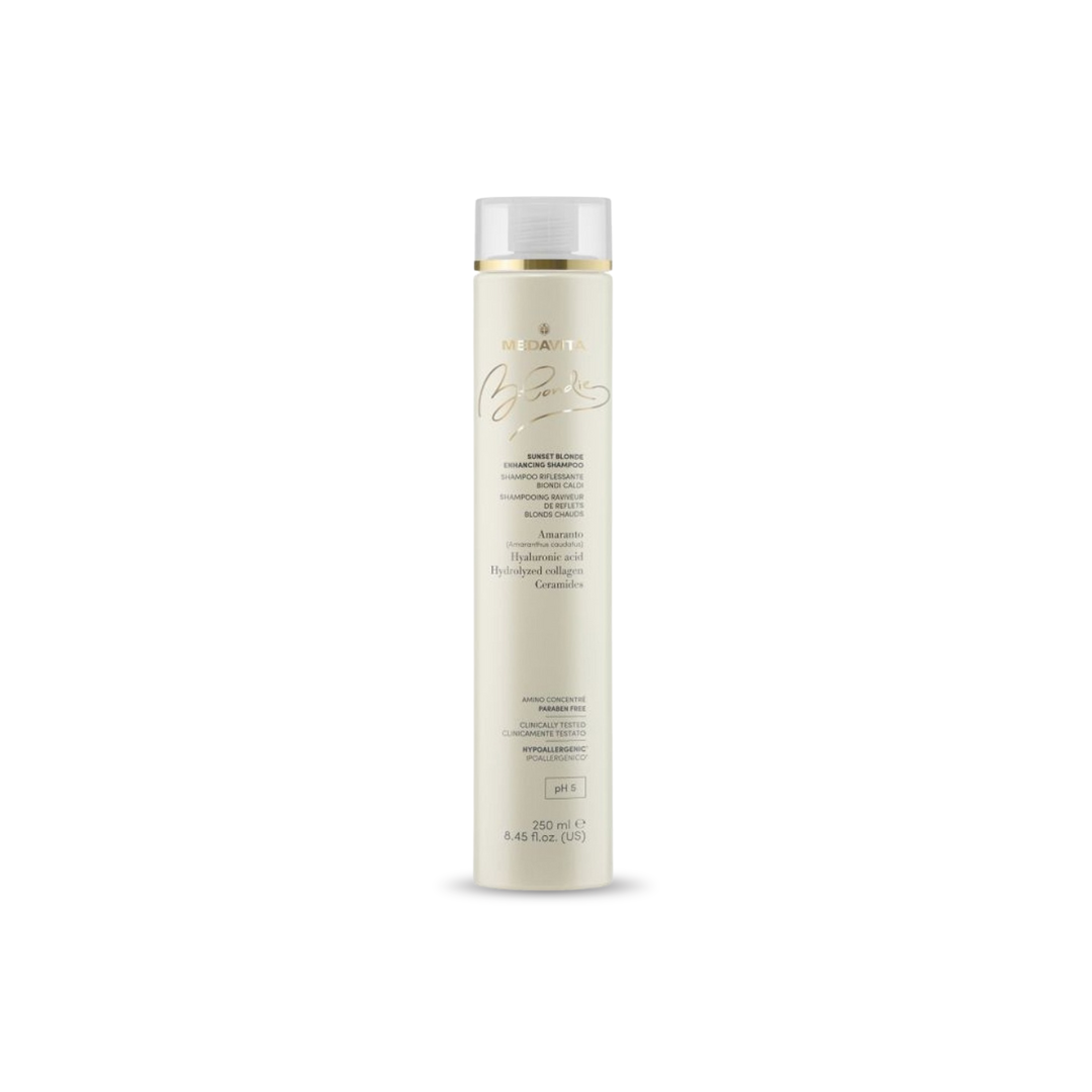 Prelungește "ora de aur" a părului tău. Medavita Sunset Blonde Enhancing Shampoo este o baie nuanțatoare care reaprinde reflexele de miere, chihlimbar și cupru, oferind în același timp o reconstrucție intensă datorită colagenului.