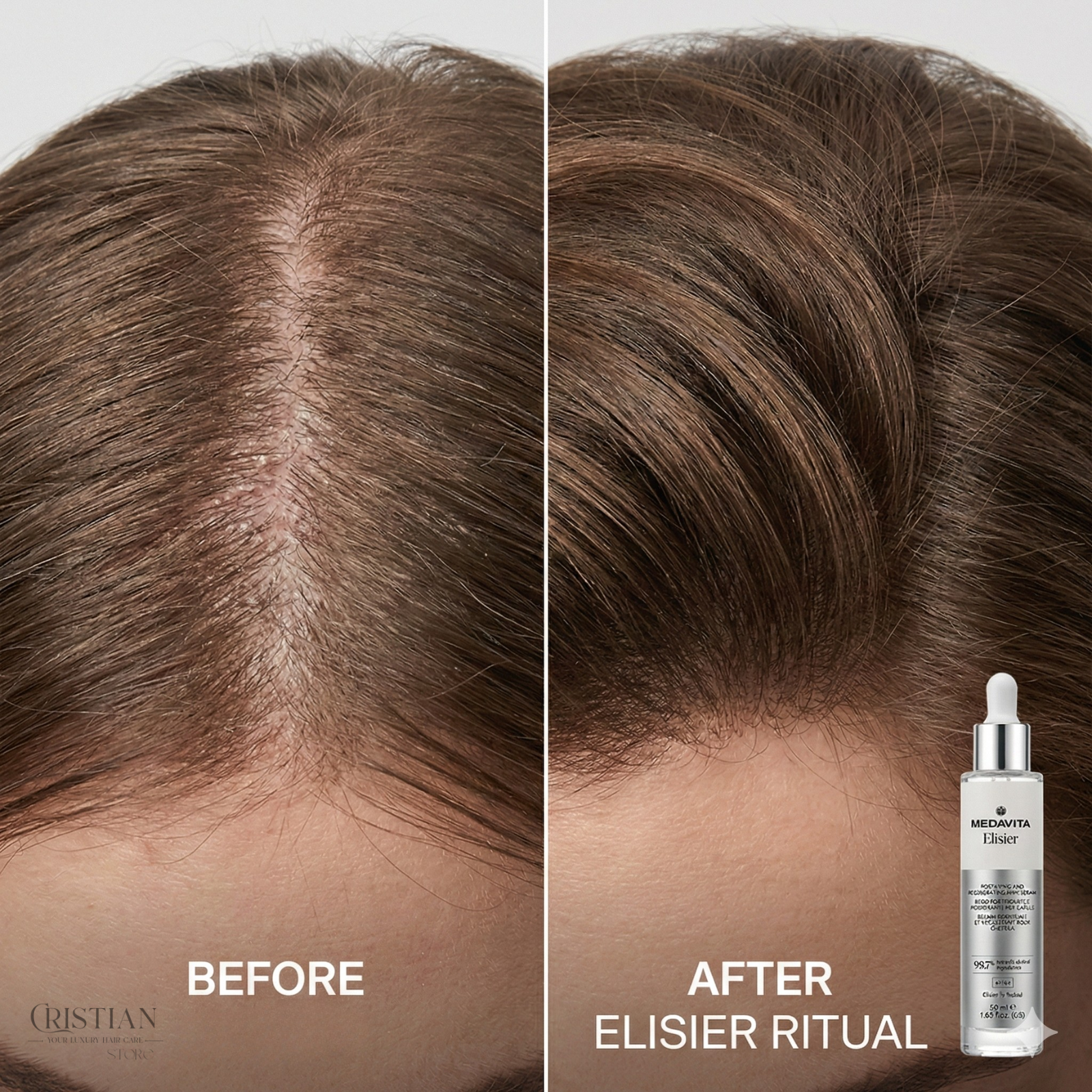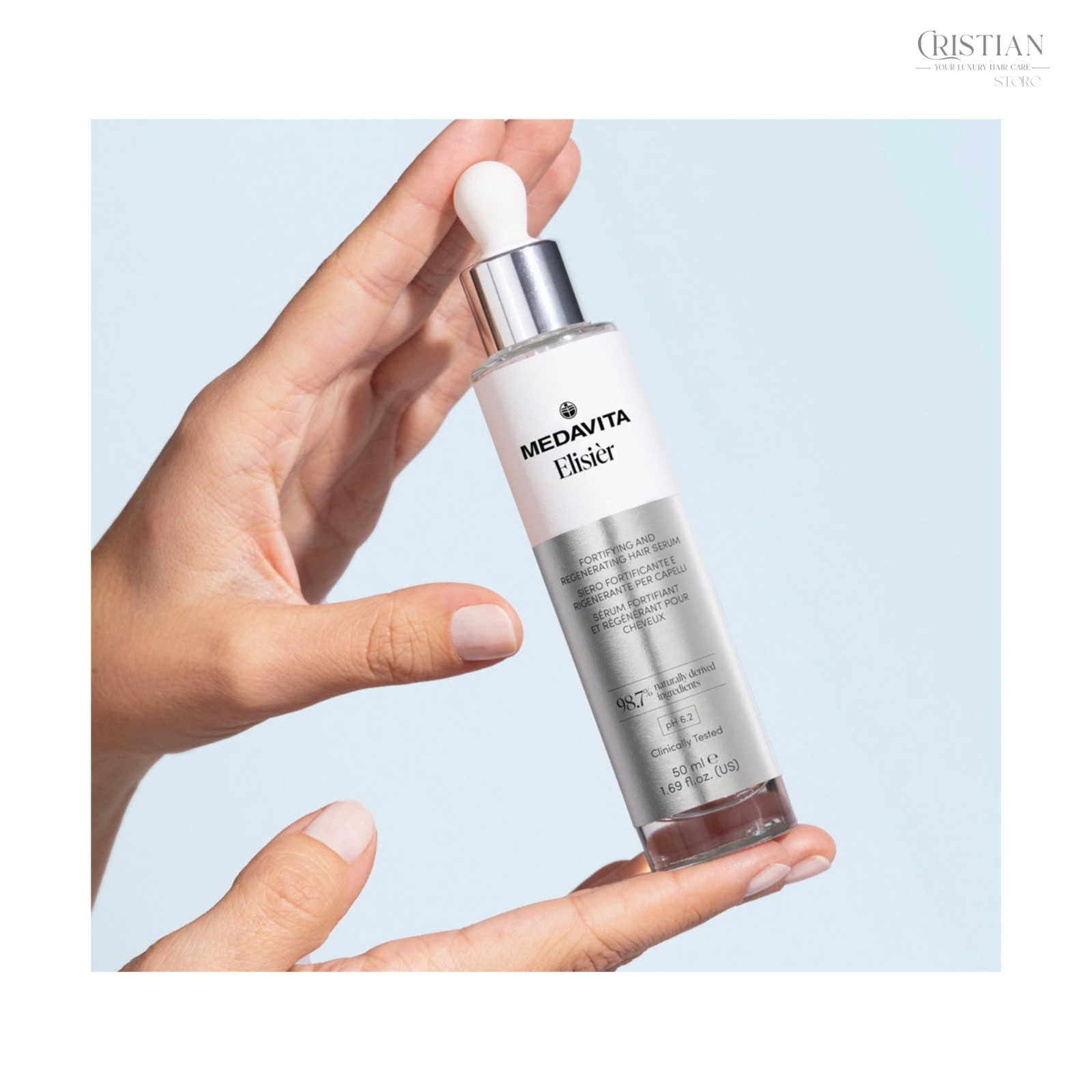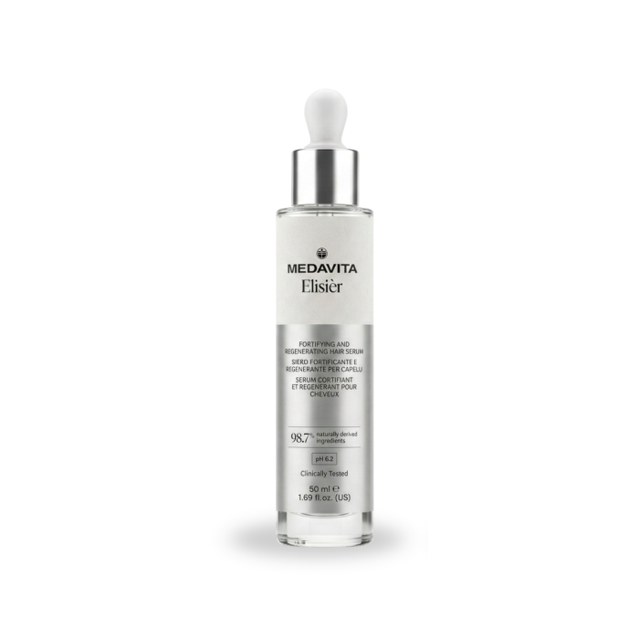 Energia pură a regenerării, picătură cu picătură. Medavita Elisier este un elixir de lux, testat clinic, creat pentru a fortifica și reîmprospăta scalpul și fibra capilară. Datorită complexului cu Acid Hialuronic, Cofeină și Bisabolol, acest ser hidratează profund, calmează iritațiile și stimulează creșterea unui păr vizibil mai dens, mai strălucitor și mai plin de vitalitate.
